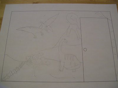 Dinosaurs: the train track from the joining wall ends in the hills here where the dinosaurs are! Off the right is where the ocean joins...but not a very good transition other than the door and a sun.
